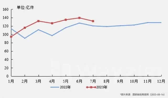 國家郵政局監(jiān)測數(shù)據(jù)顯示,2023年1月~7月,郵政行業(yè)寄遞業(yè)務量累計完成873.7億件,同比增長12.8%。其中,快遞業(yè)務量(不包含郵政集團包裹業(yè)務)累計完成703.0億件,同比增長15.5%。2023年郵政行業(yè)寄遞業(yè)務量較2022年顯著提升。